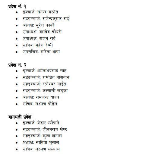 बागमती प्रदेशको इन्चार्ज केदार न्यौपाने छन् भने सह–इन्चार्जहरु जीवनराम श्रेष्ठ र कृष्ण खनाल तोकिएको छ । अध्यक्षमा सावित्रा भुसाल र सचिवमा लक्ष्मण लम्सालको नाम अन्तरपार्टी निर्देशनमा उल्लेख छ ।