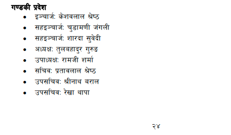 गण्डकी प्रदेशको इन्चार्जमा केशवलाल श्रेष्ठको नाम पठाइएको छ । सह–इन्चार्जहरु चुडामणी जंगली र शारदा सुवेदी रहेका छन् । अध्यक्ष तुलबहादुर गुरुङ, उपाध्यक्ष रामजी शर्मा, सचिव प्रतावलाल श्रेष्ठ, उपसचिव श्रीनाथ बराल र उपसचिव रेखा थापा रहेका छन् ।