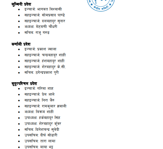 कर्णाली प्रदेशको इन्चार्जमा प्रकाश ज्वाला, सह–इन्चार्जमा चन्द्रबहादुर शाही, हंशबहादुर शाही र शेरबहादुर केसीको नाम पठाइएको छ । सचिवमा भने ठगेन्द्रप्रकाश पुरी रहेका छन् ।