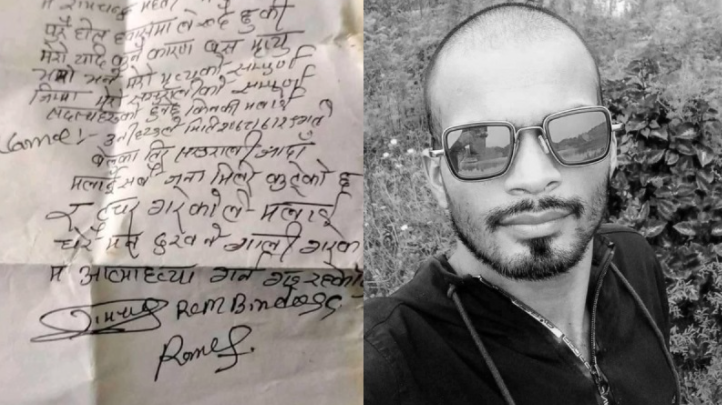 ‘म रामचन्द्र महतो, म आफ्नो पूरै होस् हवासमा लेख्दै छु कि मेरो यदि कुनै कारणवश मृत्यु भयो भने त्यसको सम्पूर्ण जिम्मा मेरो ससुरालीका सम्पूर्ण सदस्यहरूको हुनेछन’, उनले सुसाइड नोटमा लेखेका छन्, ‘किनकि मलाई उनीहरूले कार्तिक २९ गतेका दिन बेलुकातिर सबै जना मिलेर कुटेका छन् र टर्चर गरेकोले मलाई यसले धेरै मन दुख्ने गाली गरेकोले म आत्महत्या गर्न गइरहेको छु ।’