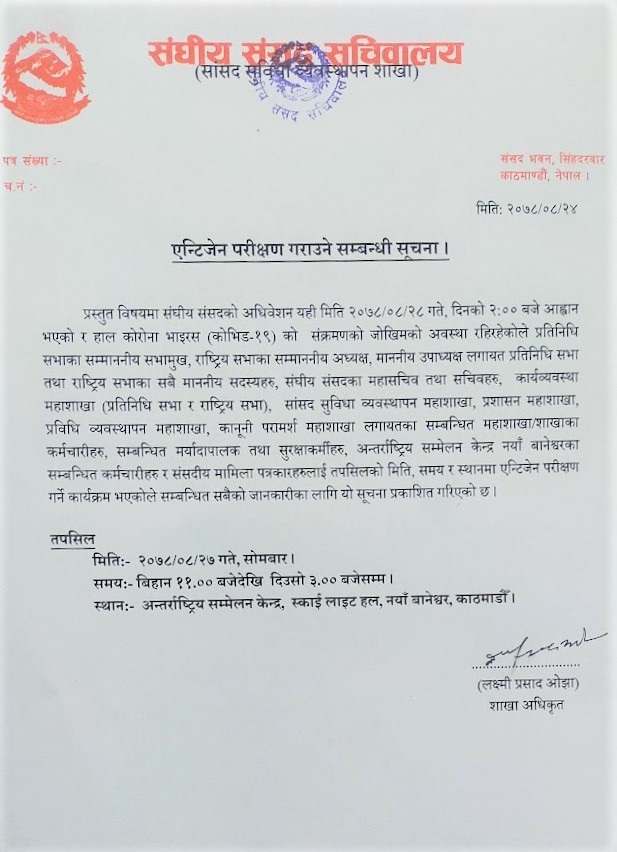 सचिवालयका अनुसार सांसददेखि सुरक्षाकर्मीहरूसम्मको सोमबार एन्टिजेन परीक्षण गरिनेछ ।