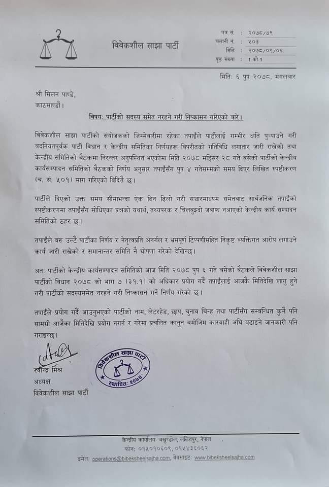विवेकशील साझाले पार्टीलाई लेखेको पत्रमा भनिएको छ, ‘तपाईंले प्रयोग गर्दै आउनुभएको पार्टीको नाम, लेटरहेड, छाप, चुनाव चिह्न तथा पार्टीसँग सम्बन्धित कुनै पनि सामग्री आजकै मितिदेखि प्रयोग नगर्न र गरेमा प्रचलित कानुन बमोजिम कारबाही अघि बढाइने जानकारी पनि गराइन्छ ।’