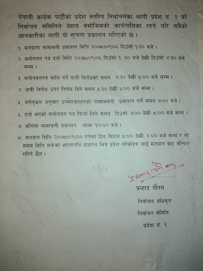 काँग्रेस प्रदेश २ अधिवेशनको निर्वाचन कार्यतालिका सार्वजनिक