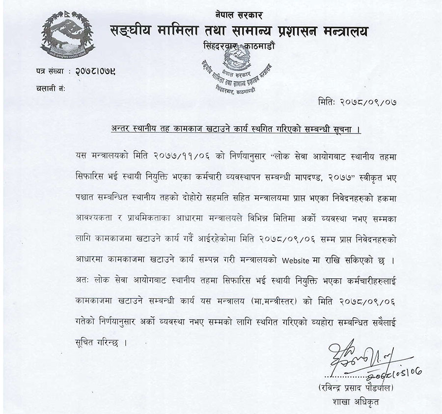 मन्त्रालयले जारी गरेको सूचनामा लोक सेवा आयोगबाट स्थानीय तहमा सिफारिस भई स्थायी नियुक्त भएका कर्मचारीहरुलाई कामकाजमा खटाउने सम्बन्धी कार्य अर्को व्यवस्था नभएसम्मका लागि स्थगित गरिएको उल्लेख छ ।