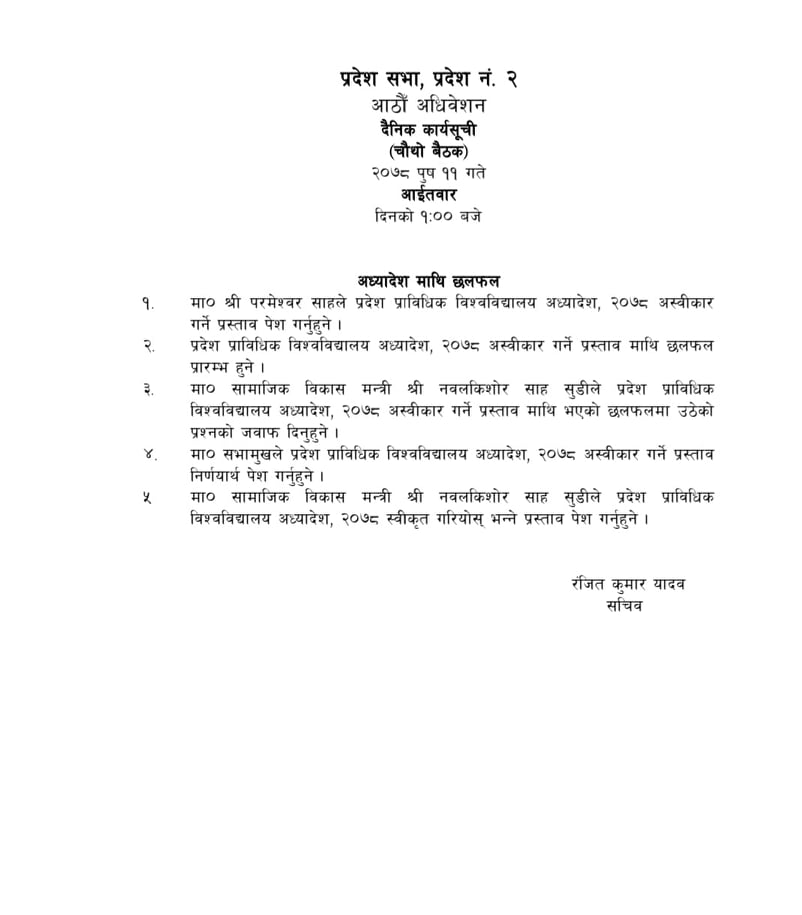 अध्यादेश अस्वीकृत गर्ने प्रस्तावमा छलफल पश्चात मन्त्री साहले जवाफ दिने र मन्त्रीले अध्यादेश पेश गरेपछि पुनः छलफल हुने कार्यसूची रहेको प्रदेशसभा सचिवालयले जनाएको छ ।