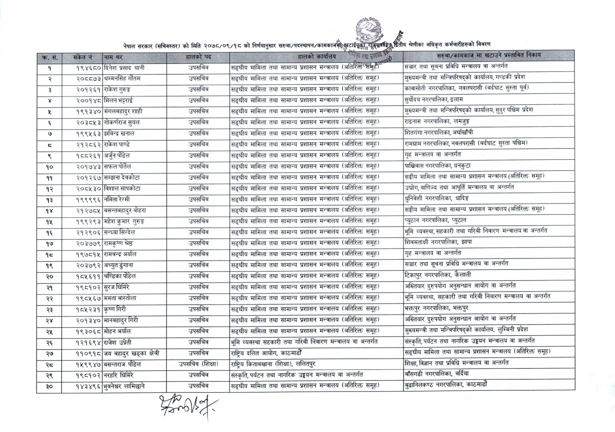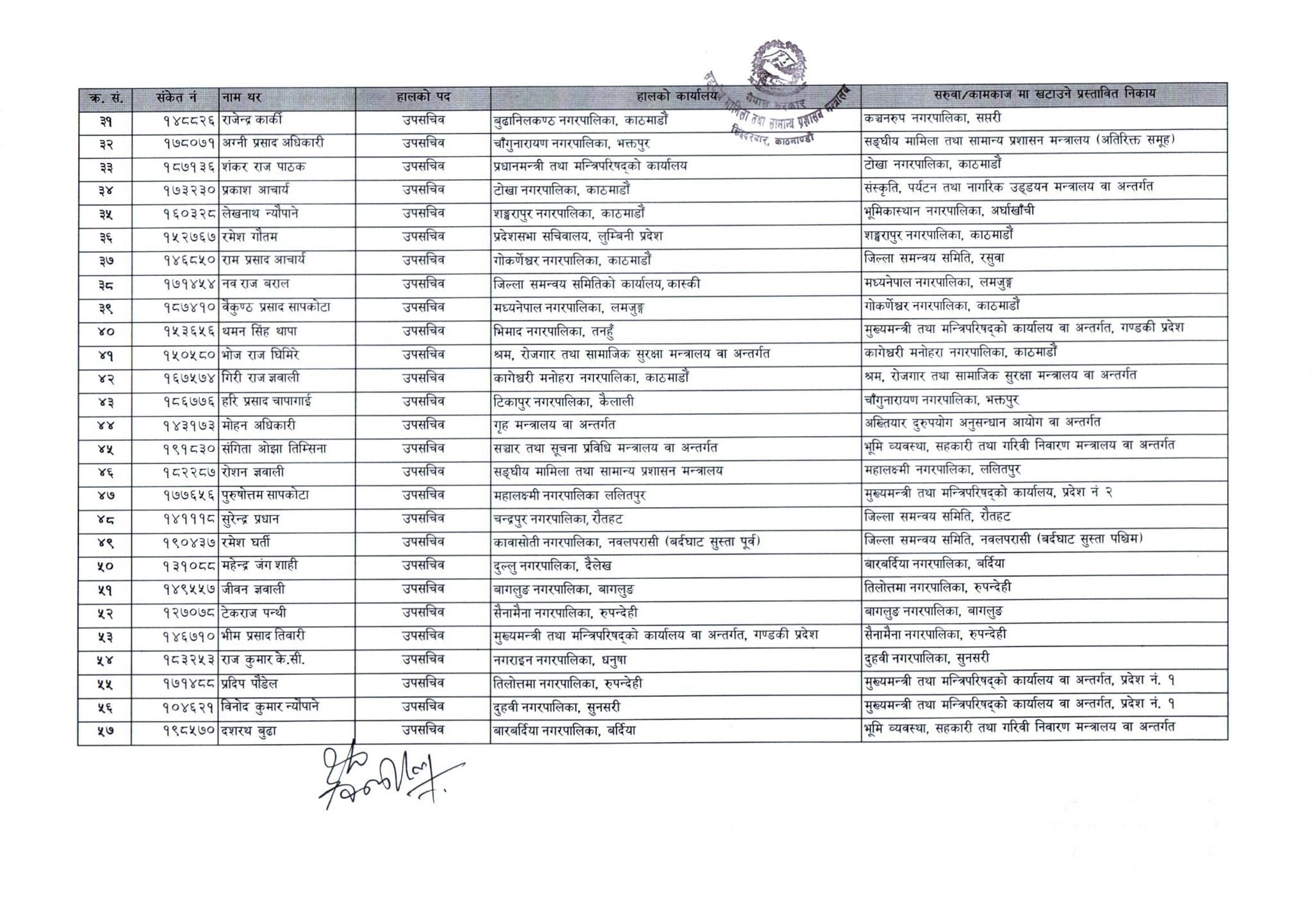 उनीहरूलाई मन्त्रालय मातहतका निकाय, प्रदेश तथा स्थानीय तहसम्म सरुवा गरिएको हो ।