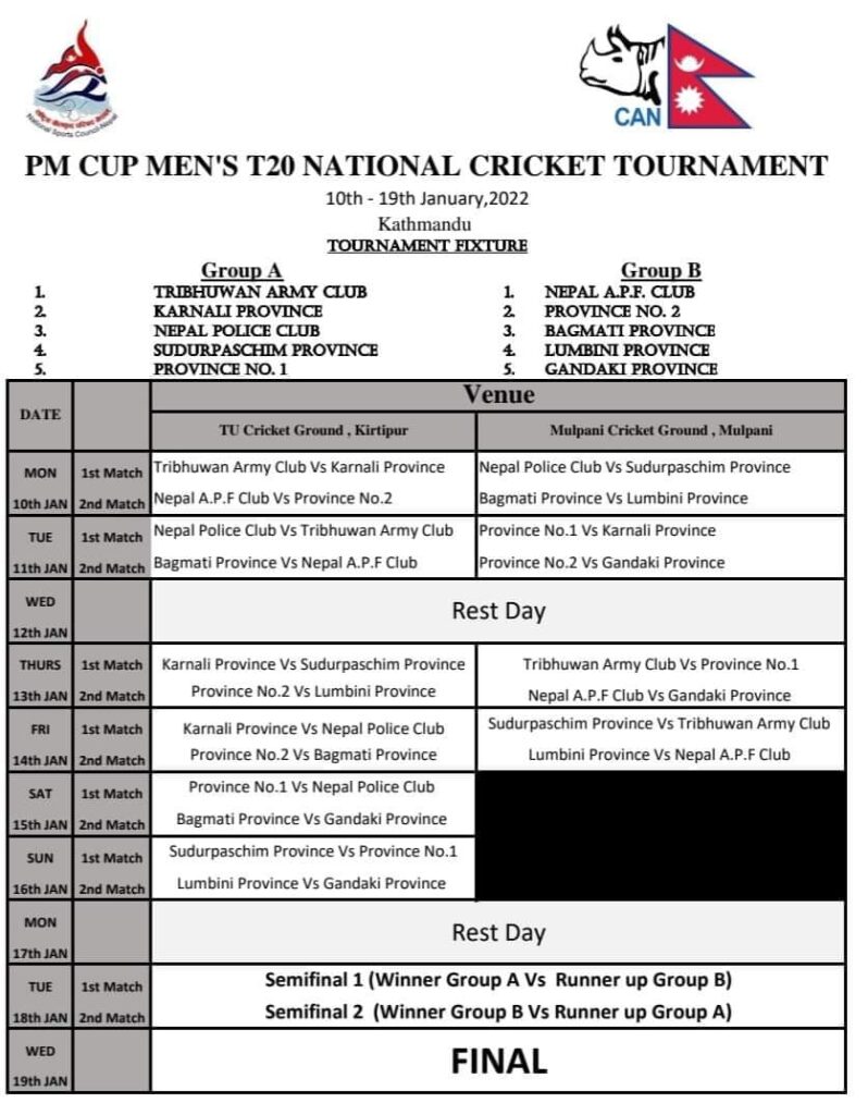 उद्घाटन खेल आर्मी र कर्णालीबीच टियु मैदानमा हुनेछ । त्यस दिन टियुमै दोस्रो खेल एपीएफ र प्रदेश २ बीच हुनेछ । त्यस दिन उता मूलपानीमा पहिलो खेलमा पुलिस र सुदूरपश्चिम भिड्नेछन् । दोस्रो खेलमा बागमती र लुम्बिनी भिड्नेछन् ।