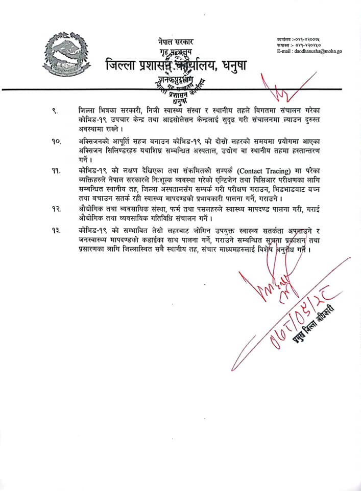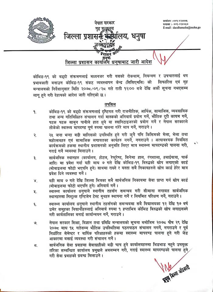 कोभिड–१९ संकट व्यवस्थापन केन्द्र (सिसिएमसि)को सिफारिश र गृह मन्त्रालयको निर्देशनअनुसार जिल्ला प्रशासन कार्यालय धनुषाले कोरोना संक्रमण फैलिन नदिनका लागि विभिन्न निर्णय गरेका छन् ।