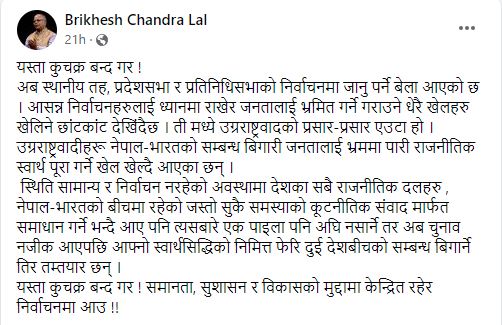 उनले भने,‘आसन्न निर्वाचनहरुलाई ध्यानमा राखेर जनतालाई भ्रमित गर्ने गराउने धेरै खेलहरु खेलिने छाँटकाँट देखिंदैछ । ती मध्ये उग्रराष्ट्रवादको प्रसार–प्रसार एउटा हो । उग्रराष्ट्रवादीहरू नेपाल–भारतको सम्बन्ध बिगारी जनतालाई भ्रममा पारी राजनीतिक स्वार्थ पूरा गर्ने खेल खेल्दै आएका छन् ।’
