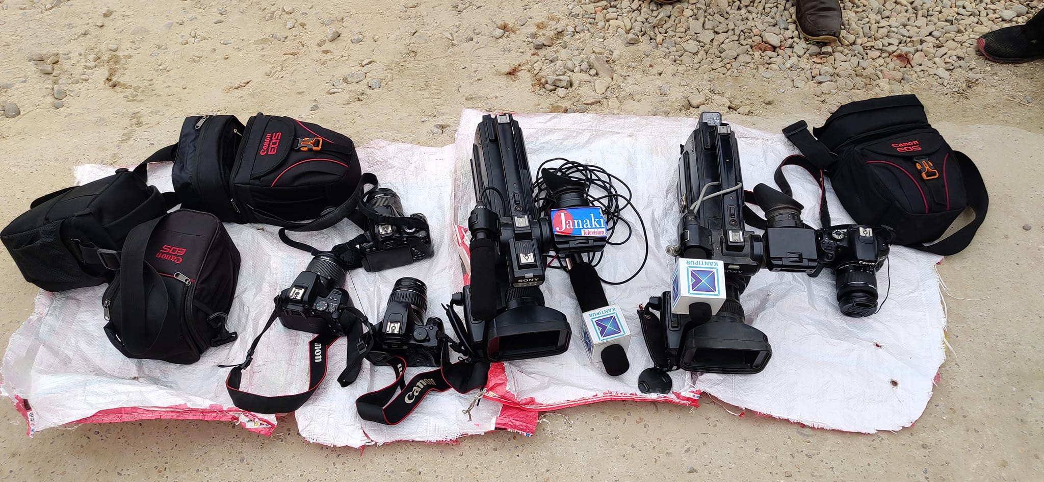 नाम र राजधानी टुंगो लगाउन भइरहेको मतदानको समाचार संकलनमा गरेको अवरोधविरुद्ध प्रदेशसभा अगाडि सञ्चारकर्मीहरु आ–आफ्ना सञ्चार सामग्री राखेर विरोध जनाईरहेका छन् ।