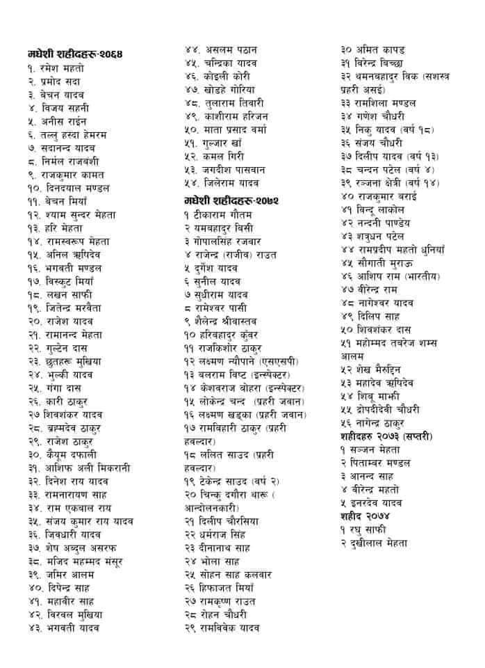 मधेस आन्दोलनको क्रममा ११७ जना सहीद भएको तथ्यांक छ । जसअन्र्तगत २०६३/०६४ मा ५४ जना, २०७२/०७३ मा ५६ जना, २०७३ मा ५ जना (सप्तरी) र २०७४ मा २ जनाले शहादत प्राप्त गरेका छन् ।