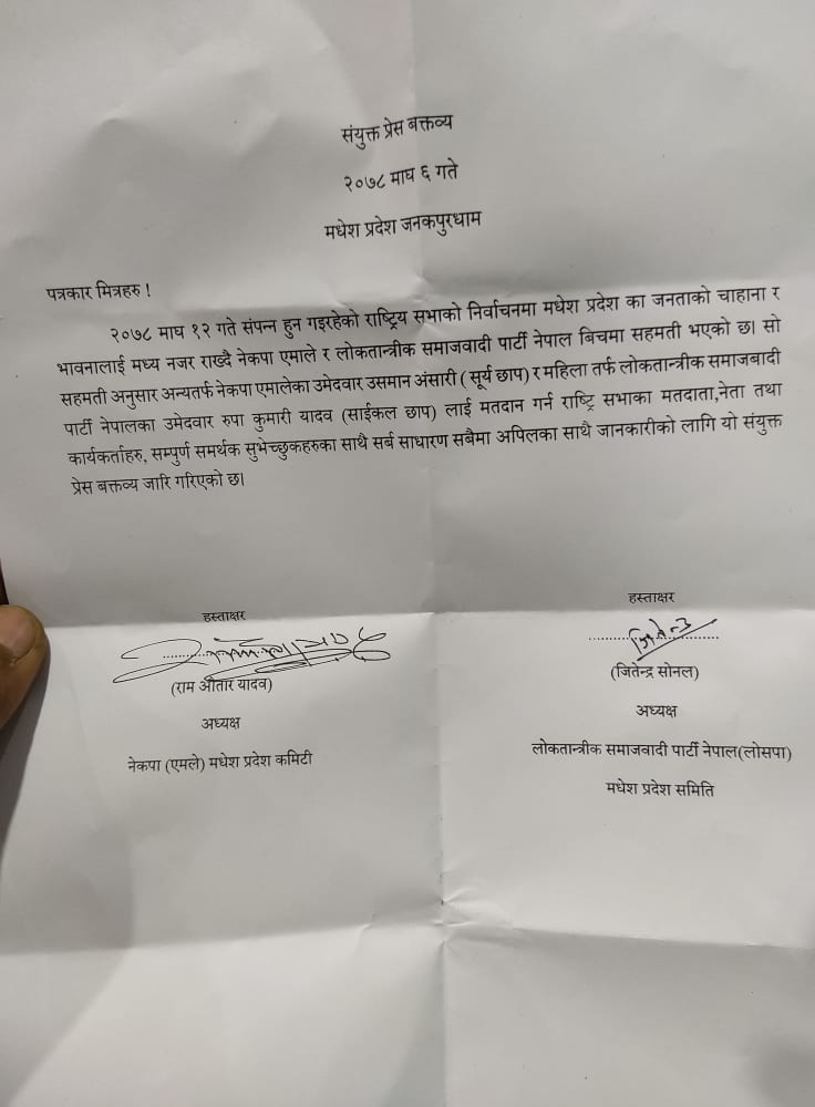 राष्ट्रियसभा निर्वाचनमा मधेश प्रदेशका जनताको चाहना र भावनालाई मध्यनजर गर्दै नेकपा एमाले र लोकतान्त्रिक समाजवादी पार्टी नेपालबिच सहमति भएको बताइएको छ ।