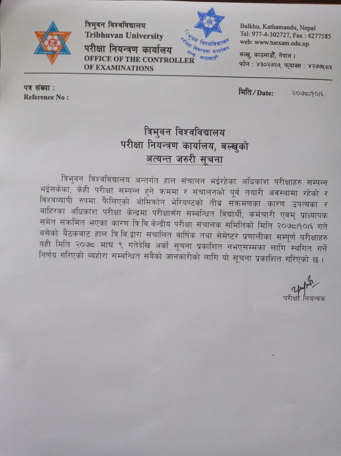 बिहीबार बसेको परीक्षा नियन्त्रण कार्यालयको बैठकले माघ ९ गतेदेखिका सबै परीक्षाहरू अर्को सूचना जारी नभएसम्मका लागि स्थगित गरिएको हो ।