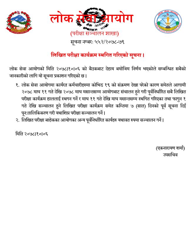 आयोगमा कार्यरत कर्मचारीमा कोरोना सङ्क्रमण देखिएको र माघ ११ गतेदेखि मसान्तसम्म सञ्चालन हुने पूर्वनिर्धारित सबै लिखित परीक्षा अहिलेका लागि स्थगन गर्ने र ती परीक्षा तथा फागुन एक गतेदेखि सञ्चालन हुने लिखित परीक्षा कार्यक्रम कम्तीमा ७ दिन पूर्व सूचनामार्फत पुनःतालिकीकरण गरी सञ्चालन गर्ने आयोगले जनाएको छ ।