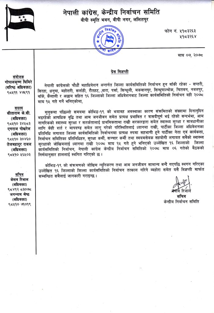 कोरोना महामारीका कारण १४ औं महाधिवेशनअन्तर्गत जिल्ला कार्यसमितिको निर्वाचन हुन बाँकी रहेका १६ जिल्लाको अधिवेशन स्थगित गर्ने निर्णय भएको नेपाली कांग्रेस केन्द्रीय निर्वाचन समितिका सचिव केशव रिजालले जानकारी दिए ।