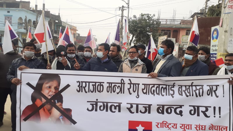 मन्त्री यादवको बर्खास्तीको माग गर्दै नेकपा एमाले निकट राष्ट्रिय युवा संघले प्रदर्शन गरेको हो । संघका केन्द्रीय सदस्य निवेश यादवको नेतृत्वमा सयौं युवा सडकमा उत्रिएर नाराबाजीसहित प्रदर्शन गरेका हुन् ।