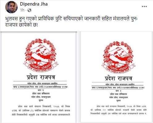 प्रदेश सरकारका मुख्य न्यायाधिवक्ता दिपेन्द्र झाले भुलवस हुन गएको प्राविधिक त्रुटि सच्याइएको जानकारी सहित मन्त्रालयले पुनः राजपत्र छापेको बताए ।