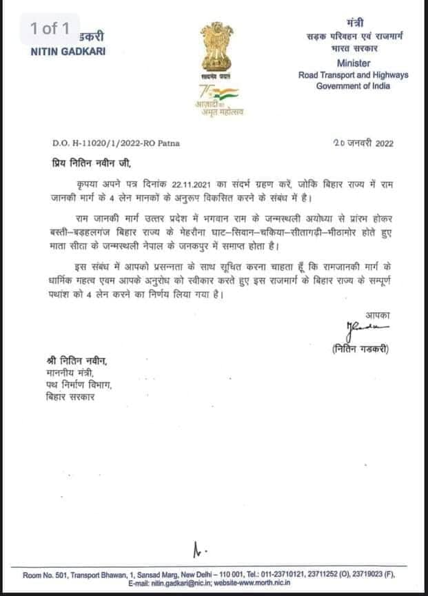 केन्द्रिय मन्त्री गडकरीद्वारा लेखिएको पत्रमा अगाडी भनिएको छ ‘रामजानकी मार्गको धार्मिक महत्व र तपाईको अनुरोधलाई स्वीकार गर्दै यस राजमार्गको विहार राज्यको सम्पूर्ण भाग ४ लेनको बनाउने निर्णय भएको छ भन्ने कुरा खुशीका साथ जानकारी गराउन चाहन्छु ।’