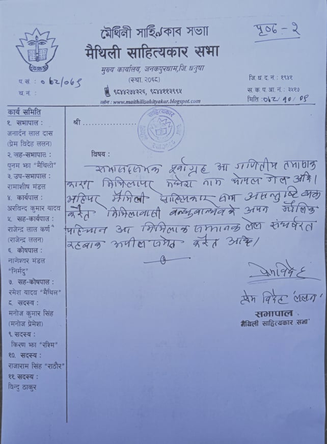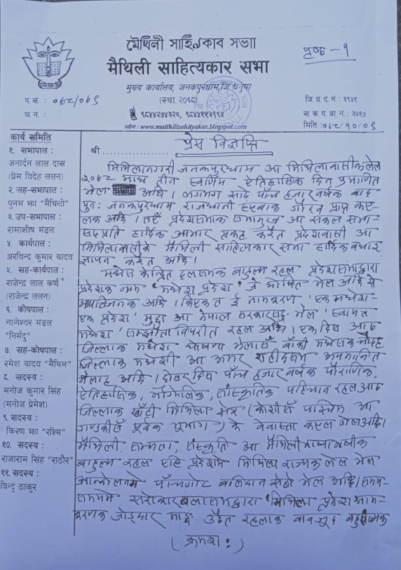 आफ्नो मौलिक पहिचान र मिथिलाको पहिचानका लागि संघर्षरत रहन अपिल समेत गरिएको छ ।