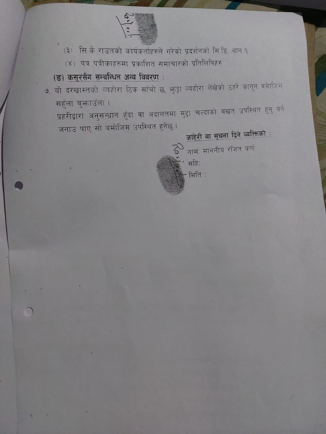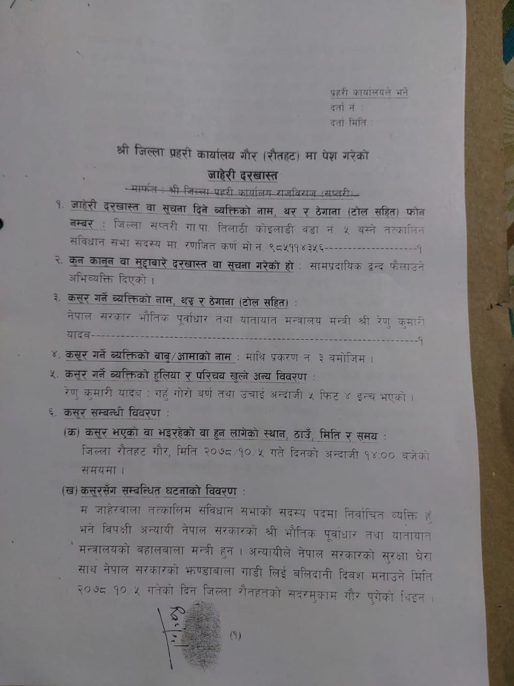 कर्णले भने,‘जिल्ला प्रहरी कार्यालय सप्तरीमा जाहेरी दिन खोज्दा उनीहरुले लिन मानेनन्, पछि हुलाकमार्फत जिल्ला प्रहरी कार्यालय रौतहटमा जाहेरी पठाएको हुँ ।’