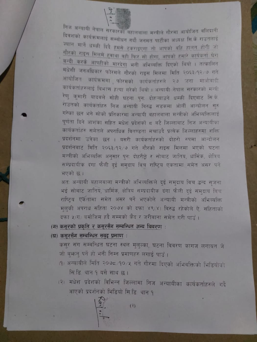 ‘मन्त्रीको अभिव्यक्तिले दुई समुदायबीच द्वन्द सृजना भई सोबाट जातिय, धार्मिक, क्षेत्रिय सम्प्रदायीक दंगा फैली दुई समुदायबीच राष्ट्रिय एकता समेत असर पर्ने भएकाले अन्यायी मन्त्रीको अभिव्यक्ति मुलुकी अपराध संहिता २०७४ को दफा ४९(४) विरुद्ध रहेकोले ऐ. संहिताको दफा ५(ग) बमोजिम हदैसम्मको कैद र जरिवाना समेत गरी पाउँ–कर्णले पठाएको जाहेरीमा उल्लेख छ ।’