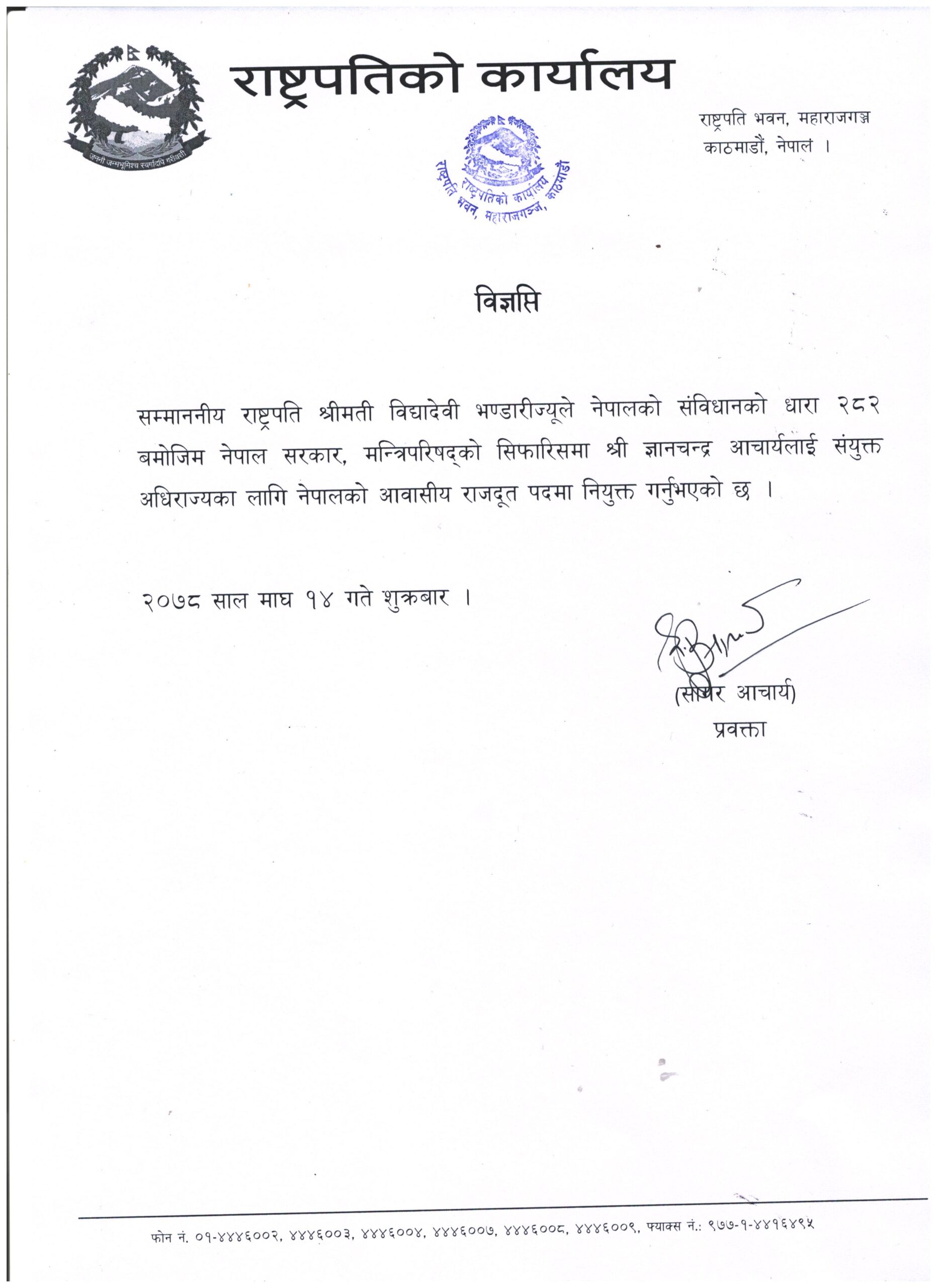 मन्त्रिपरिषद्को सिफारिसमा राष्ट्रपति भण्डारीले शुक्रबार आचार्यलाई बेलायतको राजदूतमा नियुक्त गरेकी हुन् ।