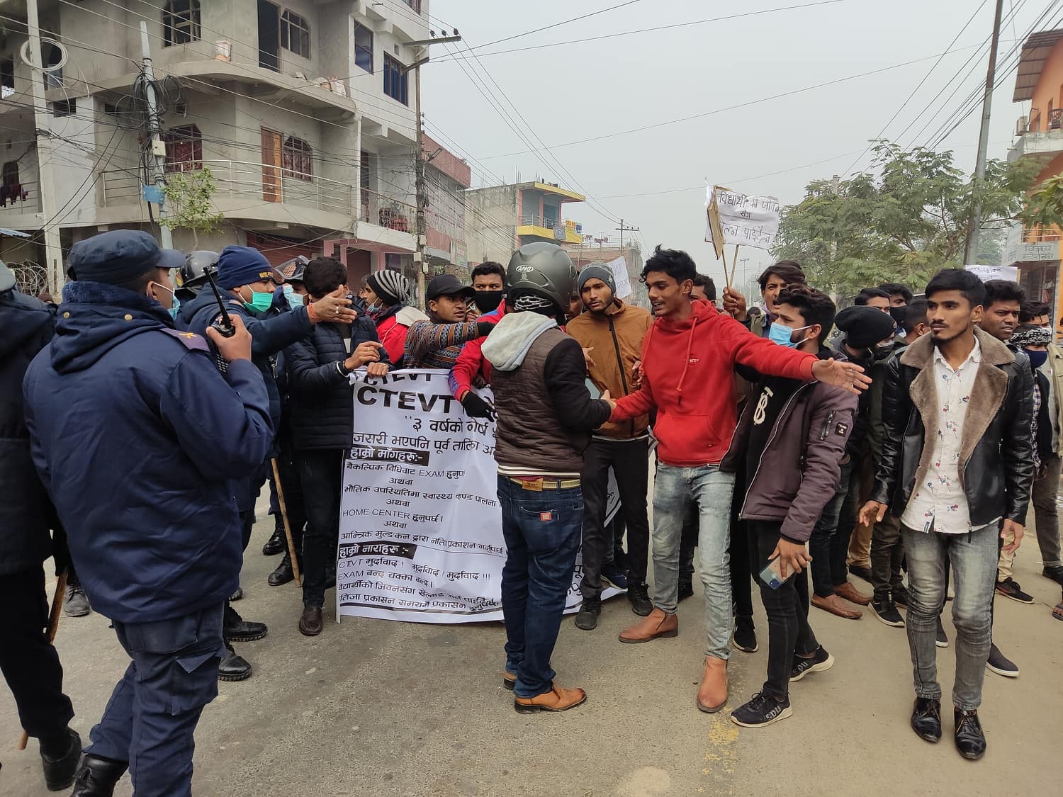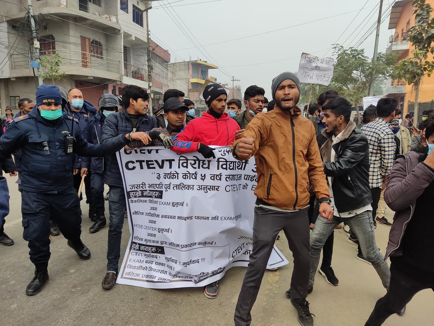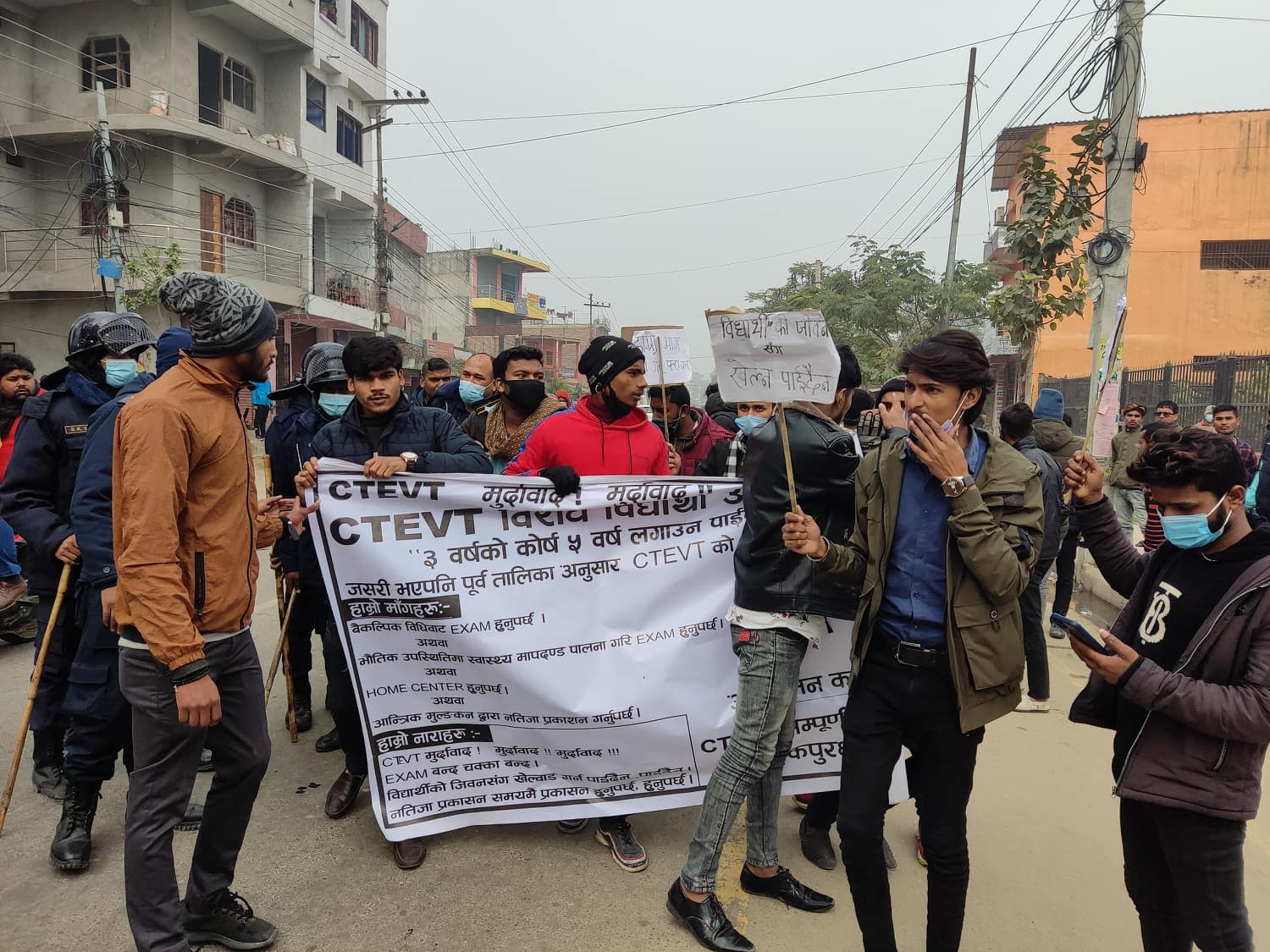 सीटीइभीटीले परीक्षा स्थगित गरेको भन्दै विद्यार्थीले नगरक्षेत्रभित्र प्रदर्शन गरेका छन् । उनीहरुले वैकल्पिक विधिबाट परीक्षा हुनुपर्ने अथवा भौतिक उपस्थितीमा स्वास्थ्य मापदण्डको पालना गरी परीक्षा सञ्चालन गर्नुपर्ने, नभए आन्तरिक मूल्यांकनद्वारा नतिजा प्रकाशन गर्नुपर्ने माग गरेका छन् ।