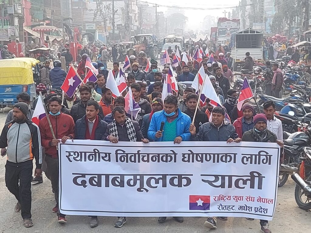 सरकारले स्थानीय तहको निर्वाचनको मिति घोषणा गर्न ढिलाइ गरेको भन्दै युवा संघले रौतहटमा प्रदर्शन गरेको हो ।