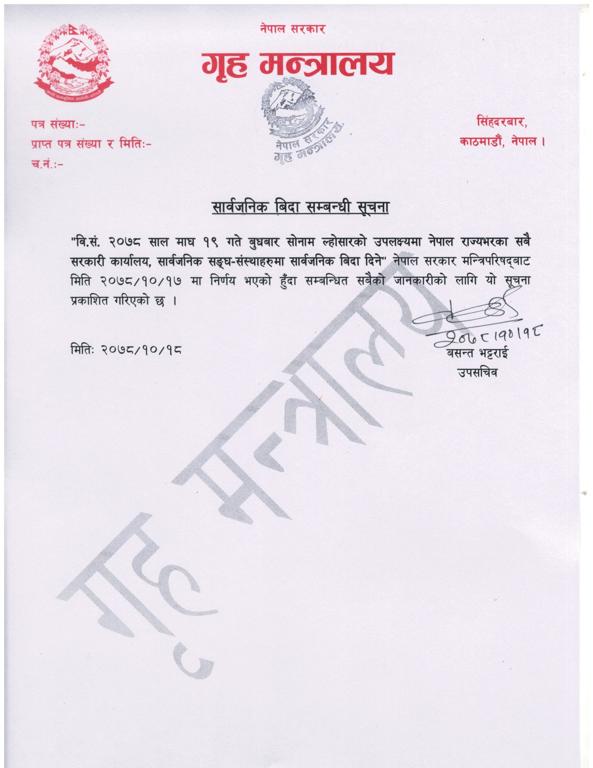 काठमाडौं, १८ माघ । सरकारले बुधबार देशभर सार्वजनिक बिदा दिने निर्णय गरेको छ ।