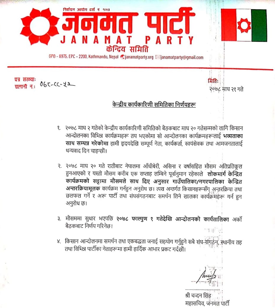 मौसममा सुधार आएपछि आन्दोलनका कार्यतालिका सार्वजनिक गर्ने पनि पार्टीका महासचिव चन्दन सिंहले जारी गरेको विज्ञप्तिमा उल्लेख छ ।