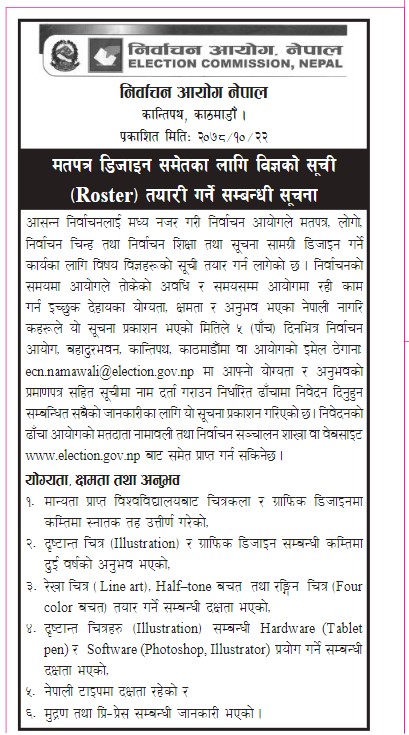 आयोगले एक सार्वजनिक सूचना प्रकाशित गर्दै मतपत्र, लोगो, निर्वाचन चिन्ह् तथा निर्वाचन शिक्षा एव्म सूचना सामग्री डिजाइनका लागि दरखास्त आह्वान गरेको छ ।