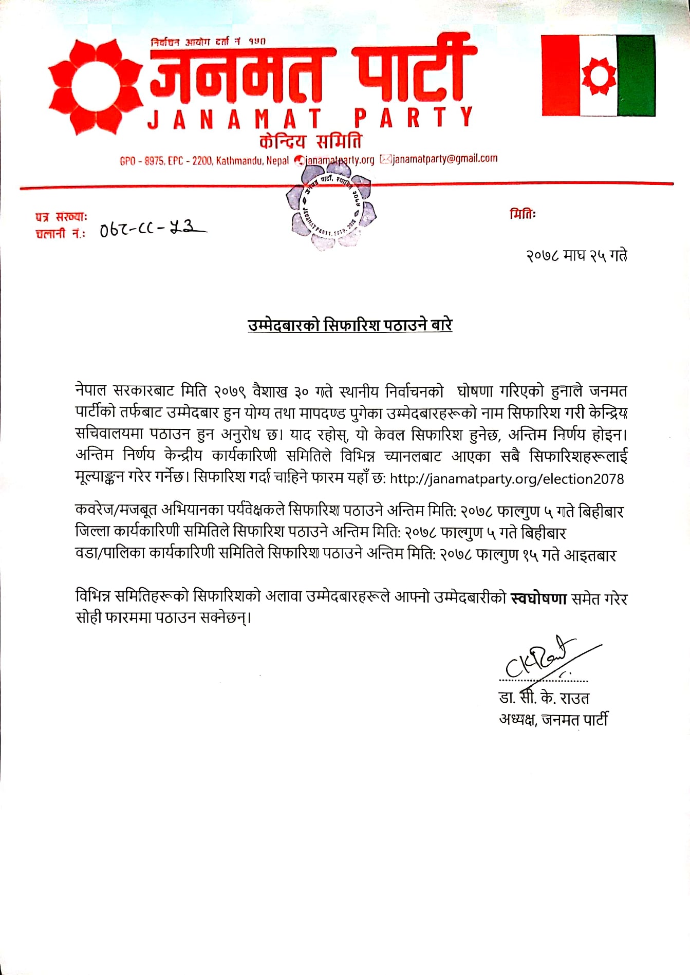 पर्टी अध्यक्ष डा. सीके राउतले उम्मेदवार सिफारिश/स्वघोषणा पठाउन परिपत्रमार्फत अनुरोध गरेका छन् । अध्यक्ष राउतले मंगलबार मातहतका कमिटीहरूमा एक परिपत्र गर्दै यस्तो आग्रह गरेका हुन् ।