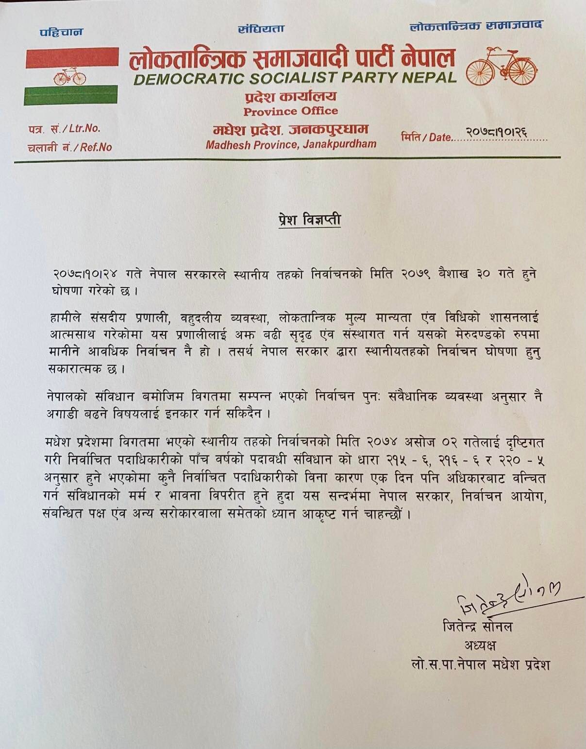 जनकपुरधाम, २६ माघ । लोकतान्त्रिक समाजवादी पार्टीले स्थानीय तहका पदाधिकारीहरुको कार्यकाल नसकिँदै सरकारले निर्वाचनको मिति घोषणा गरेकोप्रति आपत्ति जनाएको छ ।