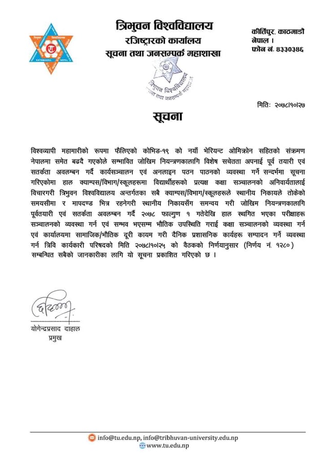 त्रिवि रजिस्ट्रार कार्यालयले आज एक सूचना जारी गर्दै पठनपाठन, परीक्षालगायत कार्यालयका सम्पूर्ण काम भौतिक उपस्थितिमै सञ्चालन गर्ने जनाएको छ ।