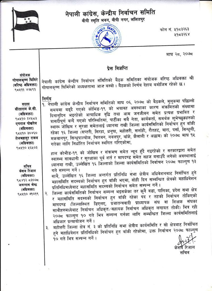 नेपाली कांग्रेसले १६ जिल्लाको अधिवेशन फागुन १३ गते गर्ने