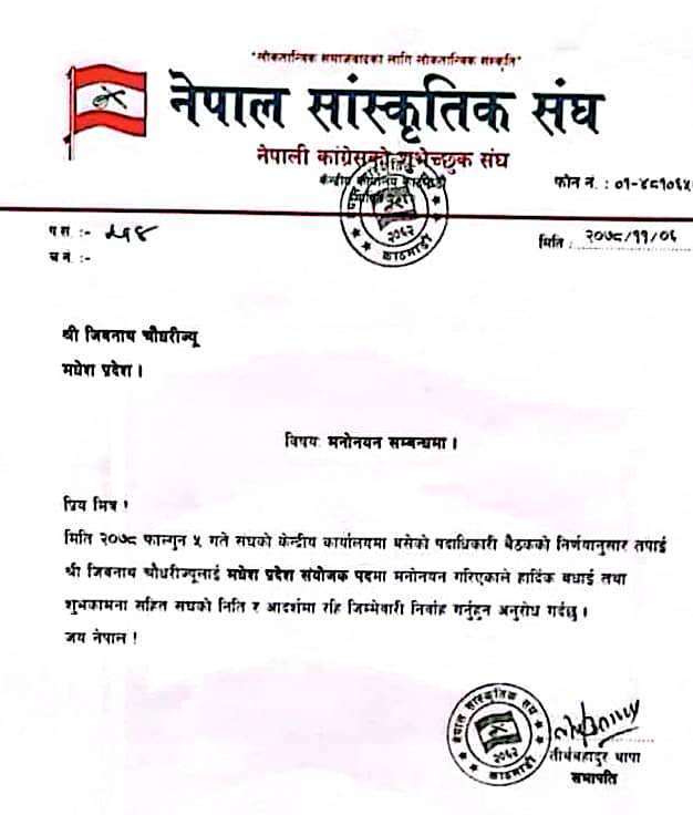 जनकपुरधाम, ८ फागुन । नेपाली कांग्रेसको शुभेच्छुक संस्था नेपाल सांस्कृतिक संघको मधेस प्रदेश संयोजकमा मैथिली विकास कोषका अध्यक्ष जिवनाथ चौधरीलाई मनोनित गरिएको छ ।