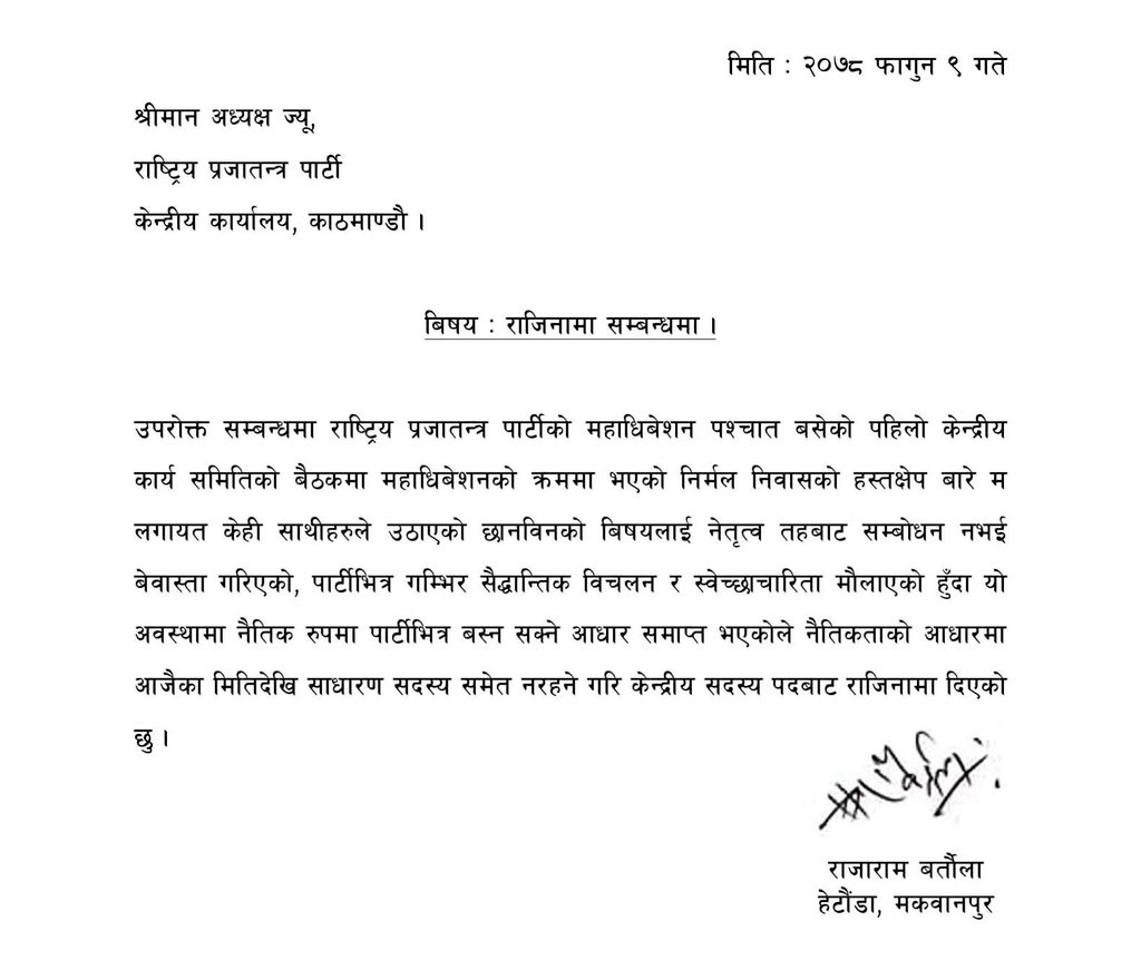 काठमाडौं, ९ फागुन । राजाराम बर्ताैलाले राप्रपाको साधारण सदस्यसमेत नरहने गरी पार्टीबाट राजीनामा दिएका छन् ।