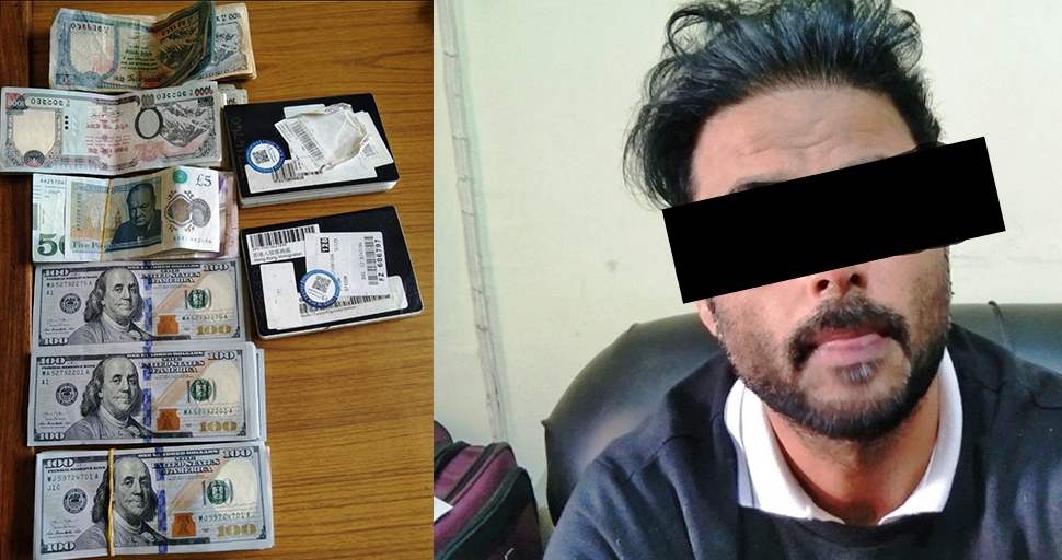 उनको झोला खानतलासी गर्दा प्रहरीले २० हजार १५० अमेरिकी डलर, ३१ हजार ६ सय नेपाली रुपैयाँ, १ हजार ३५५ युएई दिराम, ५ पाउन्ड स्टर्लिङ डलर, ५० जर्जिया लारी बरामद गरेको छ ।
