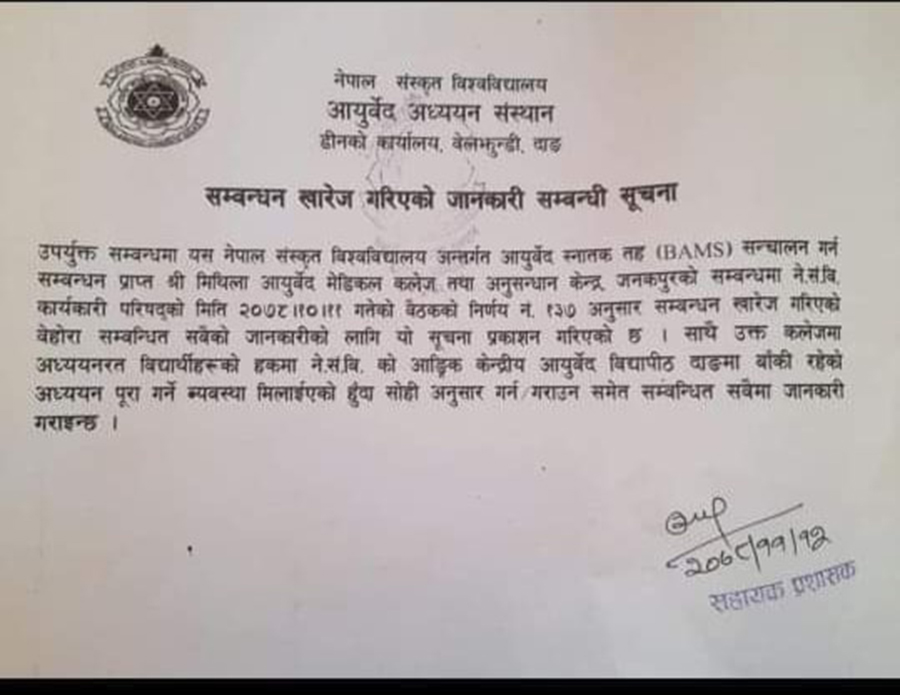 नेपाल संस्कृत विश्वविद्यालय अन्तर्गत आयुर्वेद स्नातक तह (बीएएमएस) सञ्चालन गर्न सम्बन्धन प्राप्त श्री मिथिला आयुर्वेद मेडिकल कलेज तथा अनुसन्धान केन्द्र जनकपुरधामको सम्बन्धन ने.सं.वि. कार्यकारी परिषद्को फागुन ११ गतेको बैठकको निर्णय नम्बर १३७ अनुसार सम्बन्धन खारेज गरिएको सहायक प्रशासकद्वारा हस्ताक्षरित सूचनामा उल्लेख छ ।
