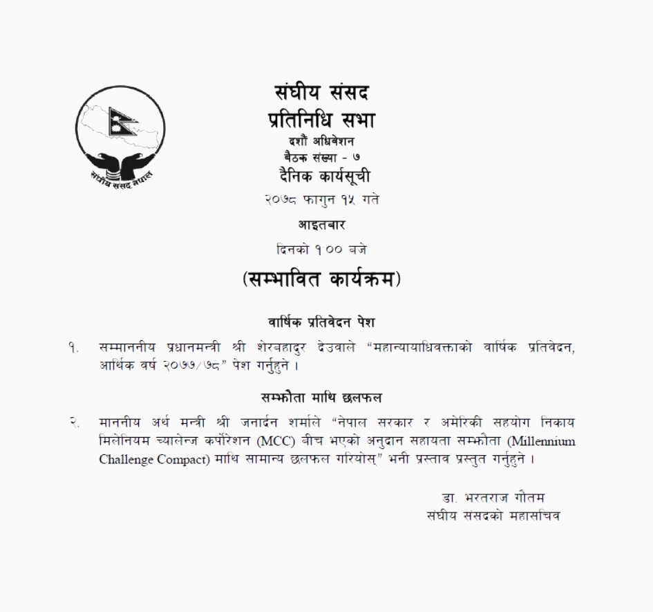 संघीय संसद सचिवालयका महासचिव डा. भरतराज गौतमले सार्वजनिक गरेको कार्यसूचीमा एमसीसी सम्झौतामाथि सामान्य छलफलका लागि अर्थमन्त्री जनार्दन शर्माले प्रस्ताव पेश गर्ने उल्लेख छ ।