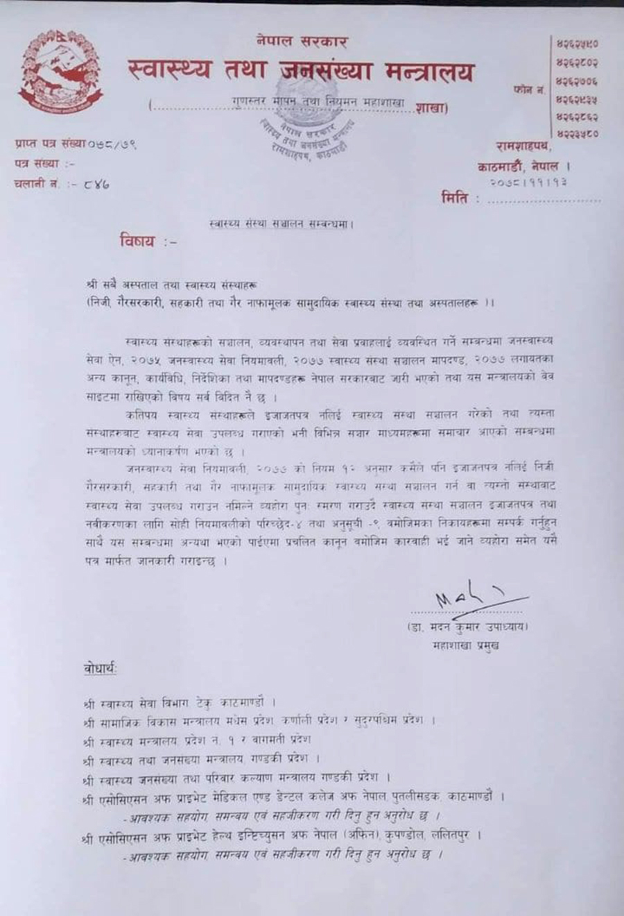 ‘जनस्वास्थ्य नियमावली २०७७ को नियम १२ अनुसार कसैले पनि इजाजतपत्र नलिई निजी, गैरसरकारी, सहकारी तथा गैर नाफामूलक सामुदायिक स्वास्थ्य संस्था सञ्चालन इजाजतपत्र तथा नवीकरण सोही नियमावलीको परिच्छेद–४ तथा अनुसूची–९ बमोजिमका निकायहरुमा सम्पर्क गर्नुहुन साथै यस सम्बन्धमा अन्यथा भएको पाइएमा प्रचलित कानुन बमोजिम कारबाही भई जाने व्यहोरा समेत यसै पत्रमार्फत जानकारी गराइन्छ,’ पत्रमा लेखिएको छ ।
