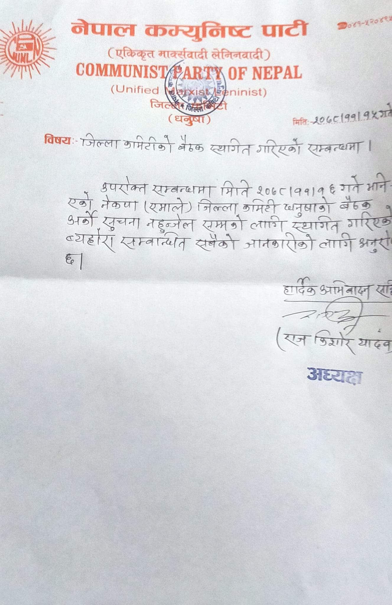 एमाले धनुषामा विवाद, जिल्ला कमिटीको बैठकबारे अध्यक्ष र सचिवको छुट्टाछुट्टै विज्ञप्ती