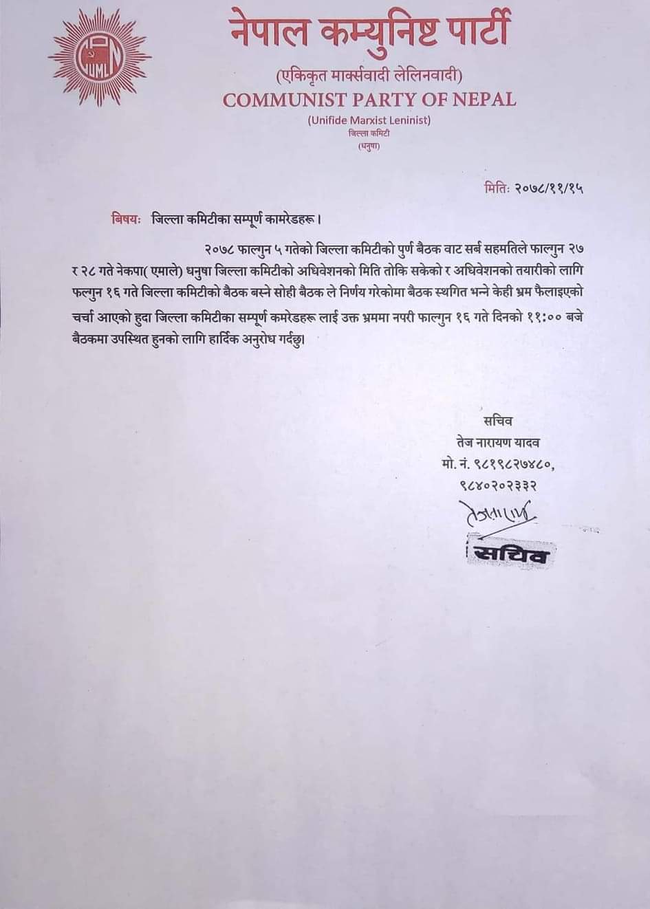 यता जिल्ला सचिव तेज नारायण यादवले फागुन ५ गतेको जिल्ला कमिटीको पूर्ण बैठकबाट सर्वसहमतिले फगुन २७ र २८ गते जिल्ला कमिटीको अधिवेशनको मिति तोकिसकेको र अधिवेशनको तयारीको लागि फागुन १६ गते जिल्ला कमिटीको बैठक बस्ने सोही बैठकले निर्णय गरेकोमा बैठक स्थगित गरिएको भ्रम फैलाइएको जिकिर गरेका छन् ।