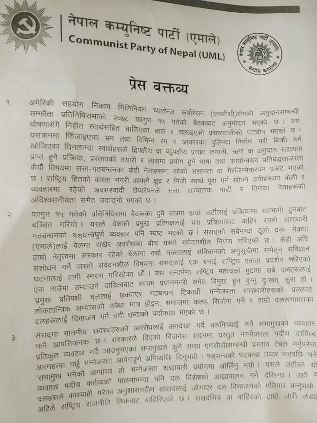 एमसीसी सरकारको ‘ठगी धन्दाको पर्दाफास’ : नेकपा एमाले
