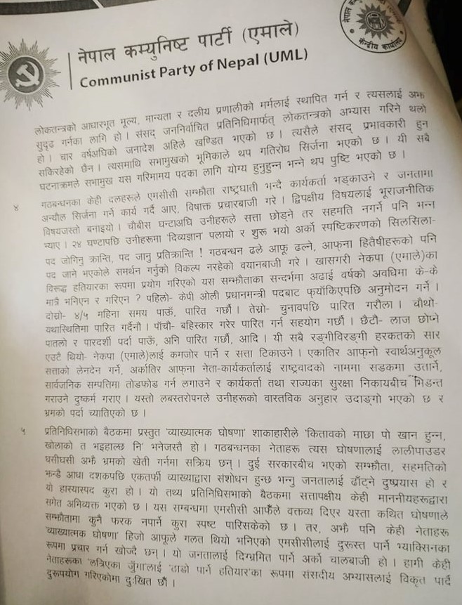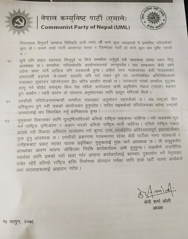 एमालेद्वारा मंगलबार आयोजित पत्रकार सम्मेलनमा अध्यक्ष केपी शर्मा ओलीको लिखित भाषणलाई उपमहासचिव प्रदिप ज्ञवालीले पढेर सुनाउँदै भने, ‘सरकारभित्रै रहेका दलले एमसीसी ठीक होइन, ठीक छैन भन्ने, एकै छिनमा सरकारमा रहिरहने तर एमसीसीको विपक्षमा मत दिने भन्ने, सरकारमै रहेर ‘राष्ट्रघाती’ प्रस्ताव भन्ने जस्ता क्रियाकलाप केही दिन हामीले देख्यौं । अन्तिममा तिनै दलले प्रस्ताव पास गरे । यो घटनाले गठबन्धन सरकारको ठगी धन्धा पर्दाफास भएको छ ।’