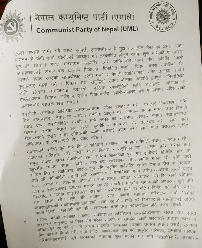 काठमाडौं, १७ फागुन । नेकपा एमालेले देशमा पछिल्लो समय भइरहेको राजनीतिक घटनाक्रम र एमसीसी प्रस्ताव संसदबाट पास हुनलाई ‘ठगी धन्दाको पर्दाफास’ भनेको छ ।