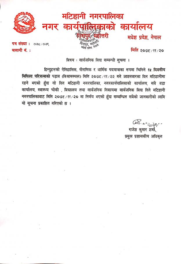 मटिहानी नगरपालिकामा भोली सार्वजनिक बिदा