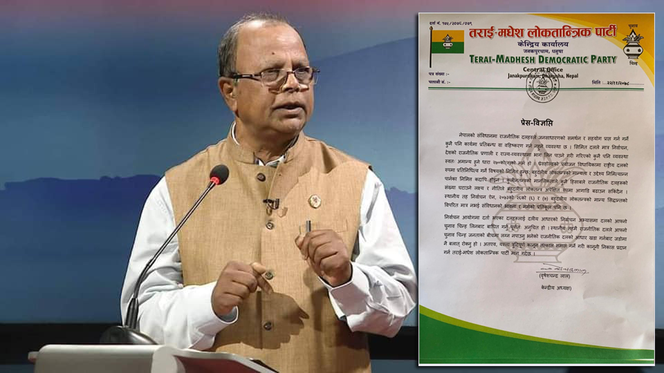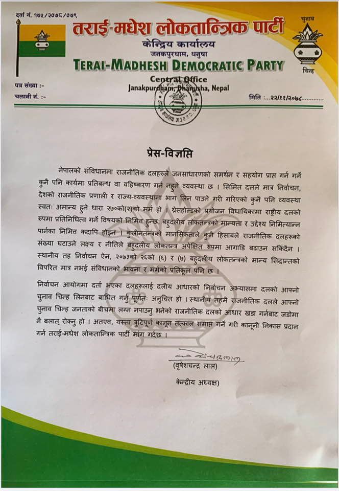तमलोपाका केन्द्रीय अध्यक्ष वृषेशचन्द्र लालले आइतबार एक विज्ञप्ती जारी गर्दै निर्वाचन आयोगमा दर्ता भएका दलहरूलाई दलीय आधारको निर्वाचन अभ्यासमा दलको आफ्नो चुनाव चिन्ह लिनबाट बाधित गर्नु पूर्णतः अनुचित रहेको बताएका हुन् ।