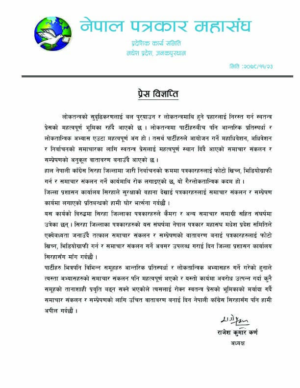 यसैबिच, नेपाल पत्रकार महासंघ मधेस प्रदेश समितिले नेपाली काँग्रेस सिरहा जिल्लामा जारी निर्वाचनको क्रममा पत्रकारहरुलाई फोटो खिच्न, भिडियोग्राफी गर्न र समाचार संकलन गर्ने कार्यमाथि रोक लगाइनु गैरलोकतान्त्रिक कदम रहेको भन्दै यस कार्यको भर्त्सना गरेको छ ।