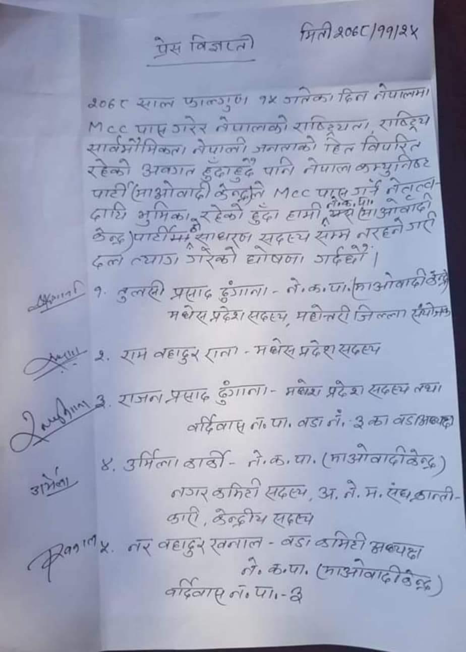 नेपालमा एमसीसी पास गरेर देशको राष्ट्रियता, राष्ट्रिय सार्वभौमिकता र नेपाली जनताको भावनासंग खेलवाड गरेको भन्दै उनिहरूले पार्टी परित्याग गरेका हुन् ।